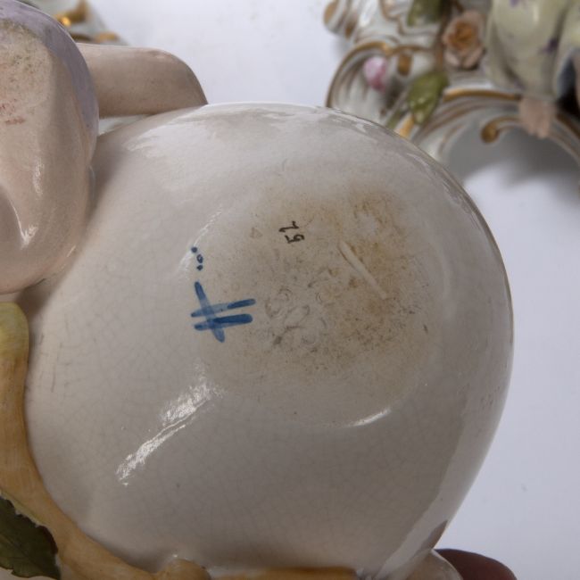 in the form of a candelabra, 33cm, eight other porcelain figures and a candelabra.