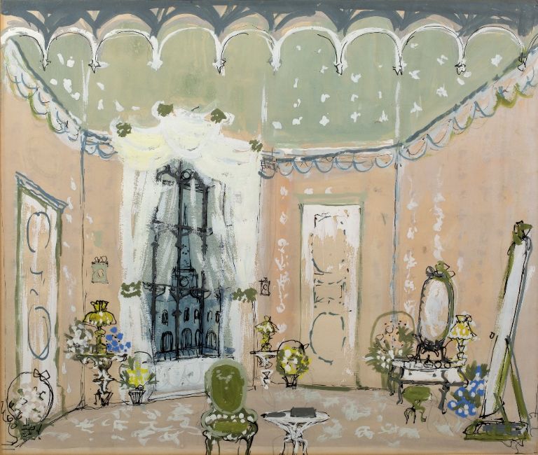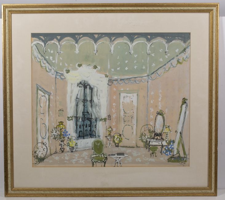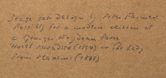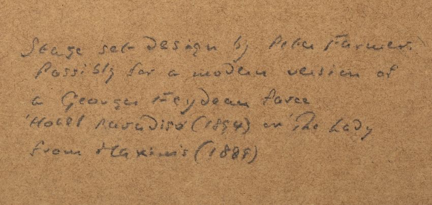 Stage set design, possibly for a modern version of L'Hôtel du Libre échange (Hotel Paradiso) or The Girl from Maxim's, watercolour and gouache, framed and glazed, 43.5cm x 52.5cm