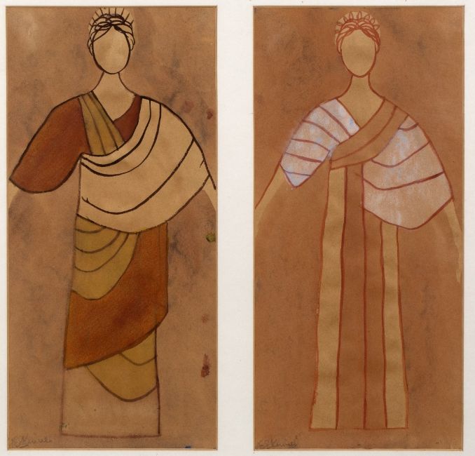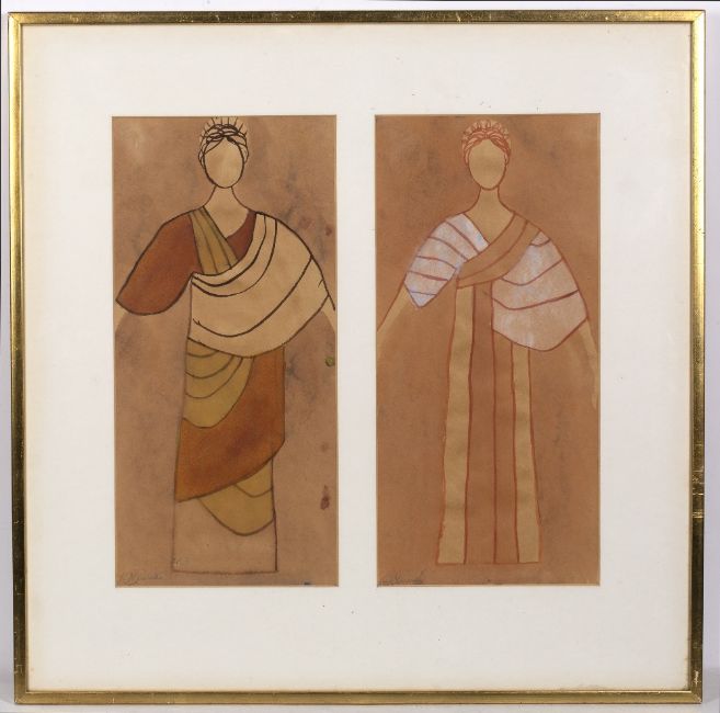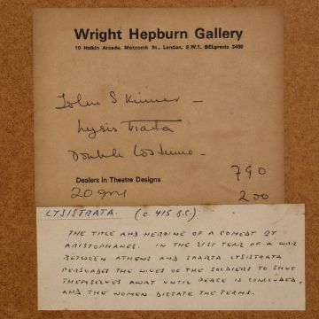 'Lysistrata, Theatre Design' two watercolours, signed to the corners, each measure 38cm x 18cm, label to the reverse reads 'Wright Hepburn Gallery, 10 Halkin Arcade, Motcomb St, London, SW1, Belgravia 3486'