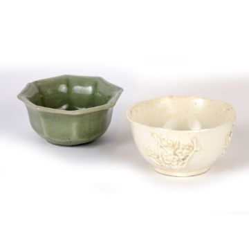 decorated in relief with three spaced sprigs of prunus, 4cm x 7.5cm and a Chinese Longquan celadon octagonal miniature wine cup/brush washer, foot unglazed, 3.5cm x 7.2cm