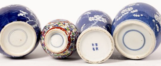 decorated in prunus leaf decoration, with a cracked ice ground, 12.5cm, 11cm high, together with a vase and cover in a similar decoration, with dog of fo finial, 26.5cm high and a clobbered decoration vase with flowering plants, 17.5cm high (4)
