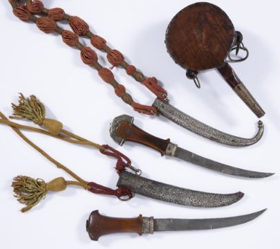 Two white metal mounted jambiya with rhinoceros horn hilt