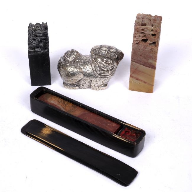 including a soapstone seal carved with a lohan in a sliding horn case, 15cm, two other soapstone seals and a white metal small box in the form of a temple dog, 9cm (4)