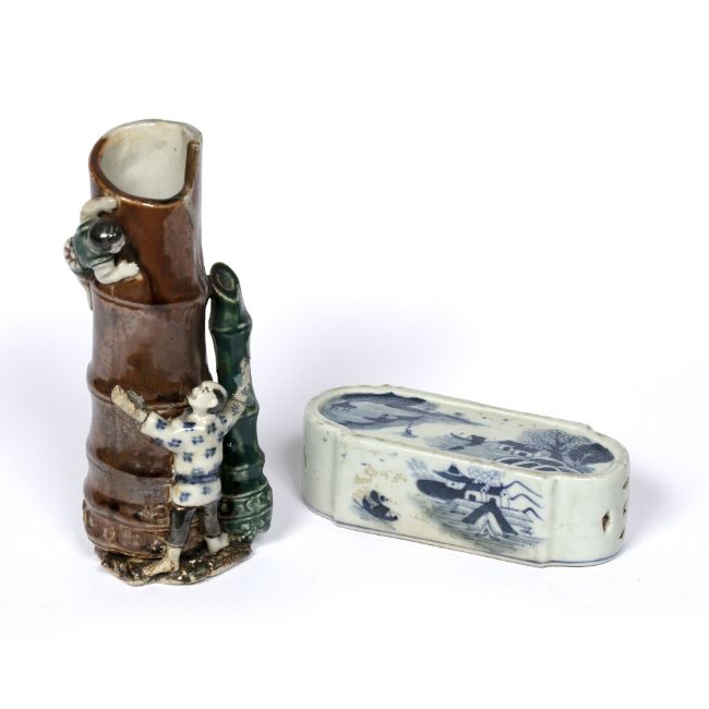 styled as a hollow brown glazed bamboo section with two applied boy figures climbing it and a Chinese porcelain underglaze blue rectangular paperweight, vase 17cm high, (2)