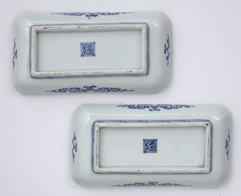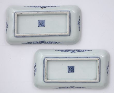 painted to the centre with flowers next to a river landscape, each with painted mark to the reverse, 21cm across (2)