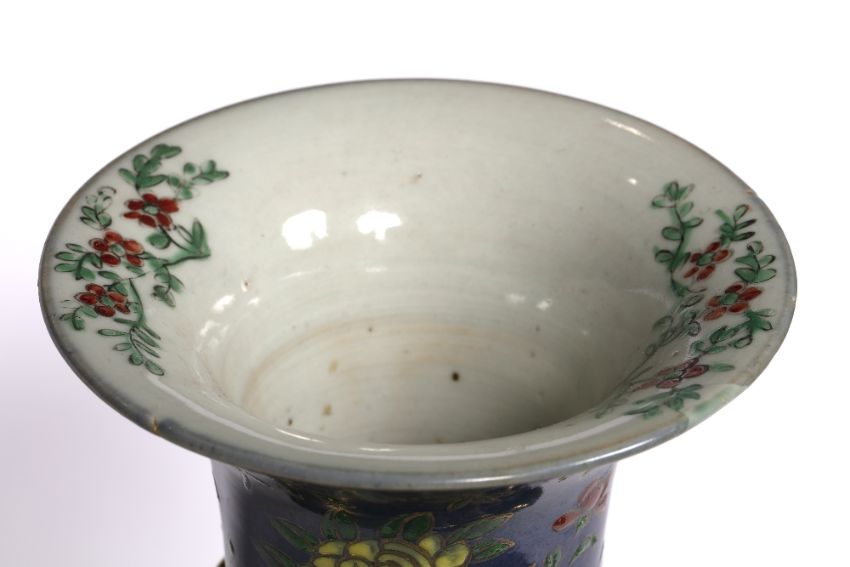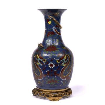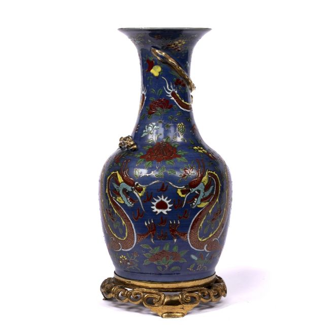decorated to the body depicting two dragons chasing a flaming pearl against a blue ground, with later metal mount to the base, 37.5cm high