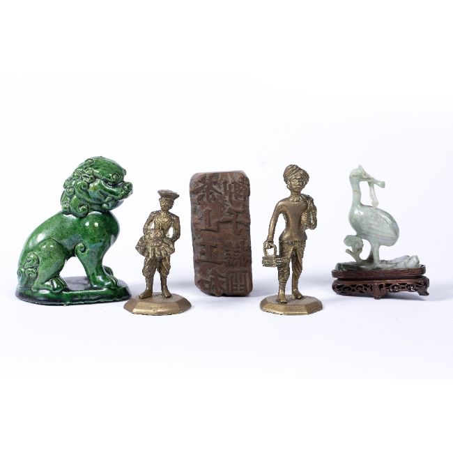 comprising a green glazed lion dog, a boxwood carved seal, a jade crane on hardwood stand and two Indian brass figures, dog 9.5cm high (5)