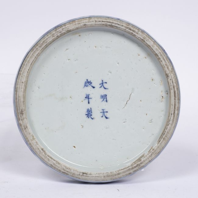 decorated to the sides with repeating symbols of flowers and dogs, with painted Tianqi mark to base, 17cm across