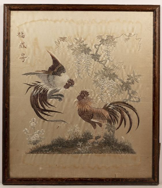 depicting fighting cockerels and wisteria, picture size 48cm x 56cm