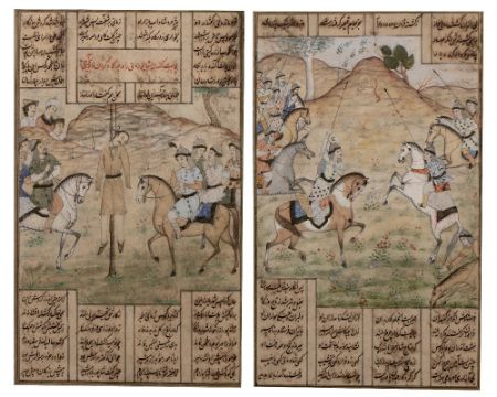 depicting hanging of Mani (proclaimed prophet born 216AD, the founder of Manichaeism), watercolour and gilt, and another watercolour and gilt illustration from Shahnameh depicting a battle, 26.2cm x 16cm (2)