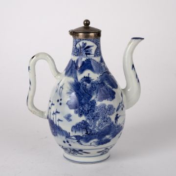 painted with a river landscape and sailing vessels, and with a white metal lid, 18.cm high