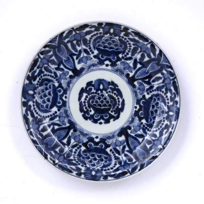 decorated to the centre with a floral roundel, the outer rim decorated with tightly packed floral themes, base with a six character Chinese Jiajing mark, 21.5cm across