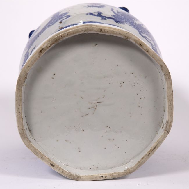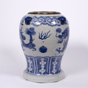 the decoration to the body depicting two dragons chasing a flaming pearl, with four animal heads around the upper body, the neck with later silver mount, 32cm high