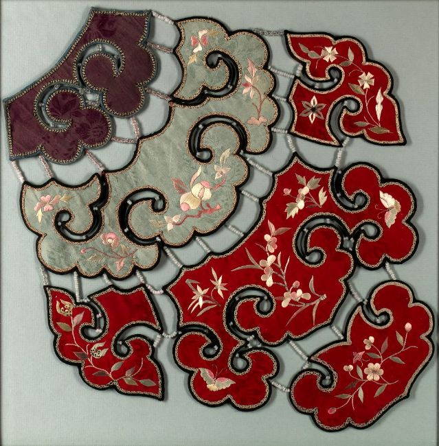 depicting fruiting plants from archaic vessels 30.5cm x 26cm, together with a framed embroidery 37cm x 36cm (3)