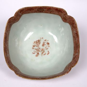 with coral and gilt painted birds, butterflies and flowers, 24cm across, 12.25cm high