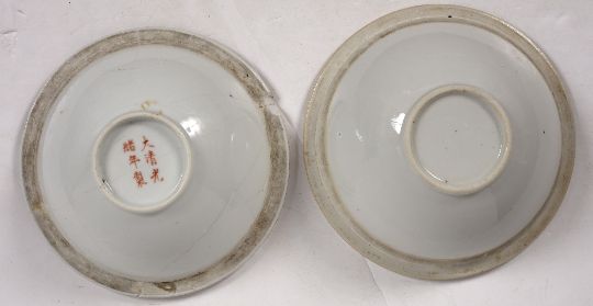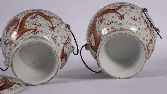 with liners, one liner with six character Guangxu mark (1875-1908), each decorated with a pair of dragons in iron red contesting a flaming pearl amid flame and cloud motifs