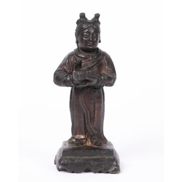 the figure holding a casket, the cast body and stand having traces of gilt, 16cm high