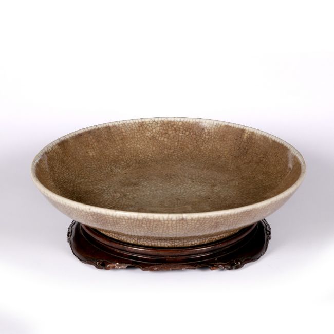 Song dynasty style with ge-type brownish celadon crackle glaze and spur marks to base, circular hardwood stand with commemorative silver plaque dated to 1919, 27cm across