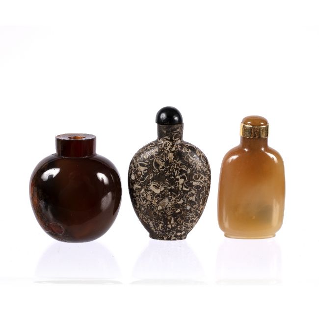 of graded light brown stone and agate stopper with old coloured band, 6cm, and a Chinese 19th/early 20th Century Chinese snuff bottle of brown/yellow puddingstone with dark stone stopper, 6cm (2)