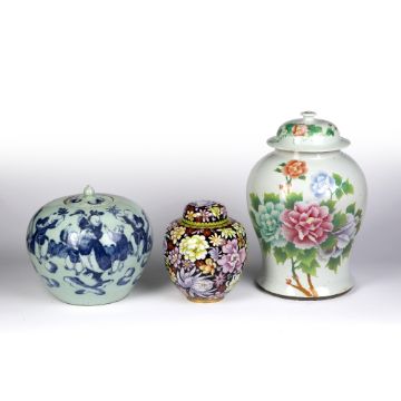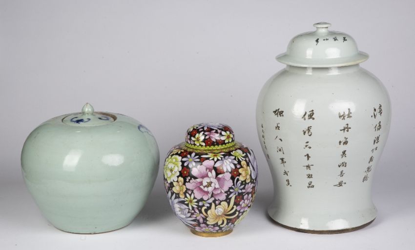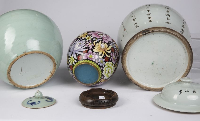 Chinese, to include a lidded Canton vase decorated with flowers to one side and calligraphy to the other, 37.5cm high, a squat lidded celadon vase decorated with children, 21cm high and a cloisonné lidded vase of black ground 19.5cm high, together with two Chinese wooden stands and a cinnabar lacquer circular small box and cover, Chinese, with leaf carved lid, 11cm across, 2.75cm high (4)