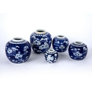 Group of five blue and white ginger jars