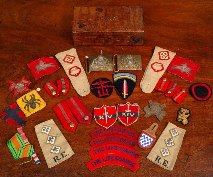A collection of regimental tabs, buttons, buckles, shoulder tabs and campaign badges belonging to Philip Reginald Astley to include a badge for The Higher Formation Supreme Headquarters Allied Expeditionary Force, an 81st West African Divison World War II printed formation badge, a pair of 14th Army badges, a British Army Combined Operations Commando shoulder patch badge, The Lifeguards patches, a pair of World War II British 8th Corp Formation sleeve patch etc.