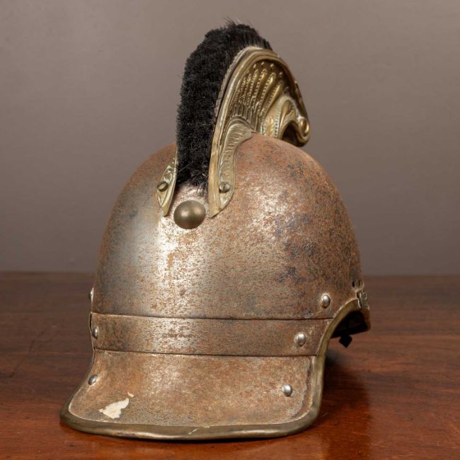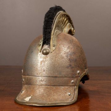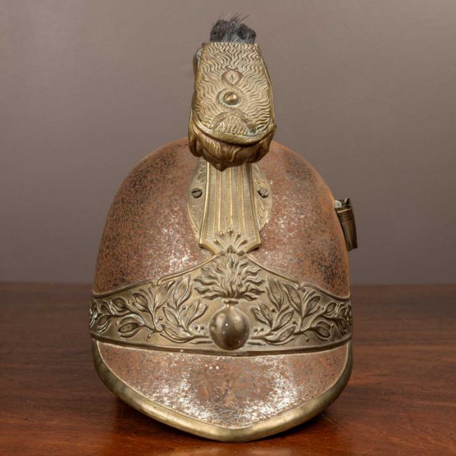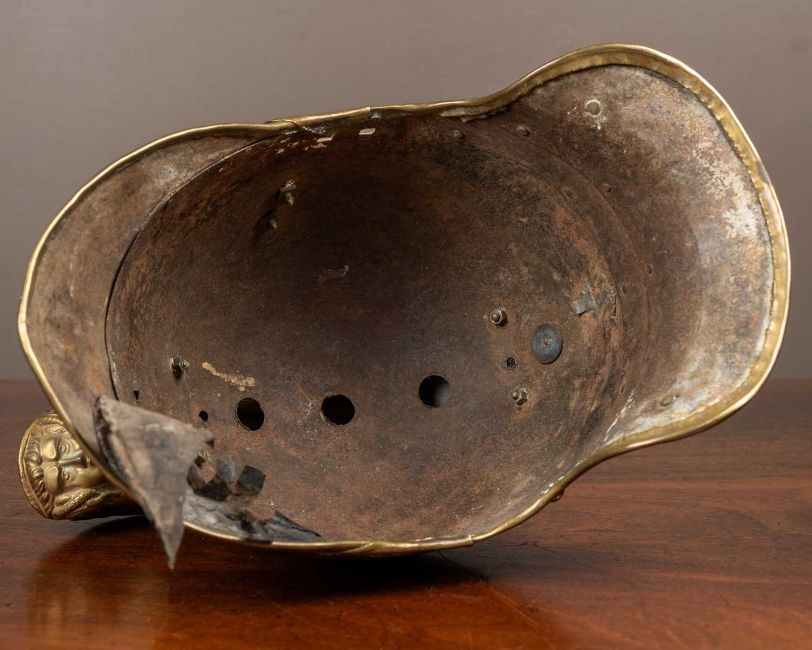 Most of the lining is missing, bar a small amount of leather on the visor. Significant oxidization to the body of the helmet. Damage to the Medusa head finial on the comb. General denting and scuffing to the brass. The roundels on the side of the helmet are not present nor is the chin strap. The tail has been trimmed.
