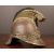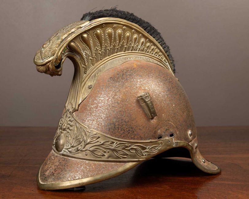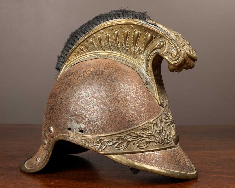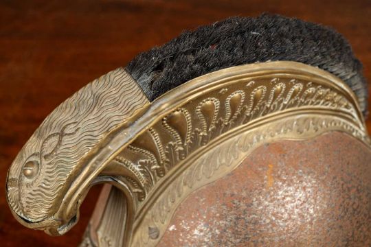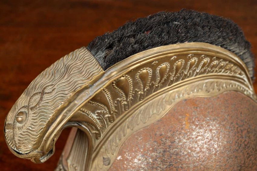 The helmet with a lobster tail, brass mounted plates depicting a flaming bomb and a laurel leaf pattern below a comb with a Medusa head finial and a close-trimmed horsehair tail.