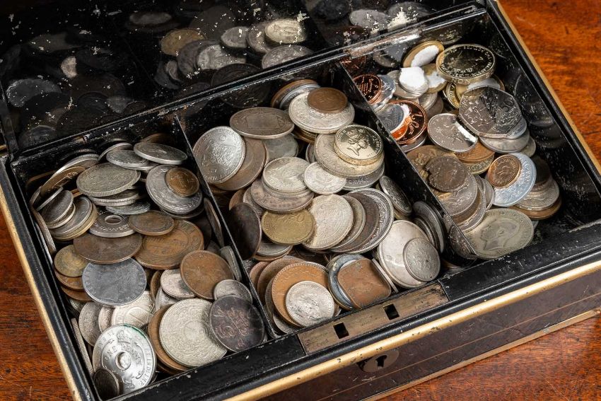 A collection of coins, largely 20th-century world coins and half pennies from the late 20th century; with one Antoninianus possibly with Victorinus head