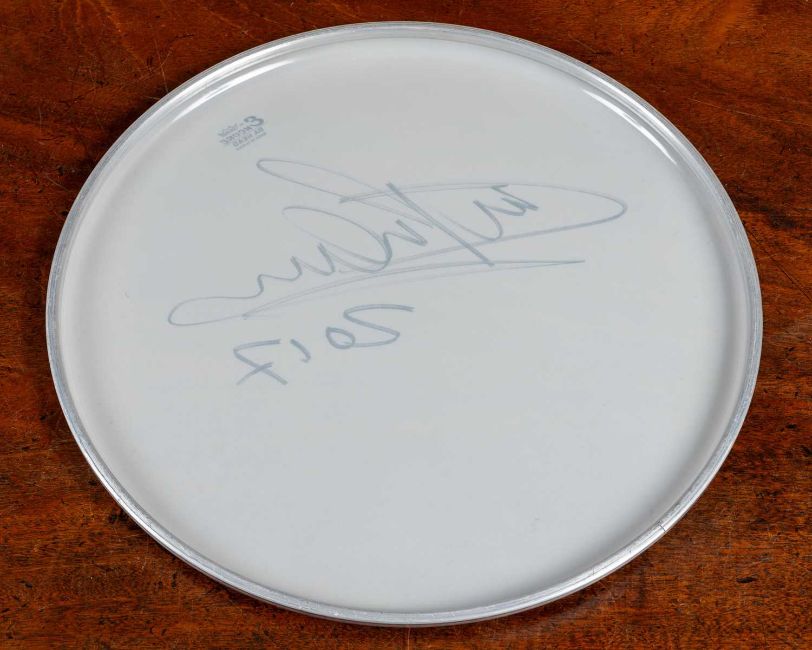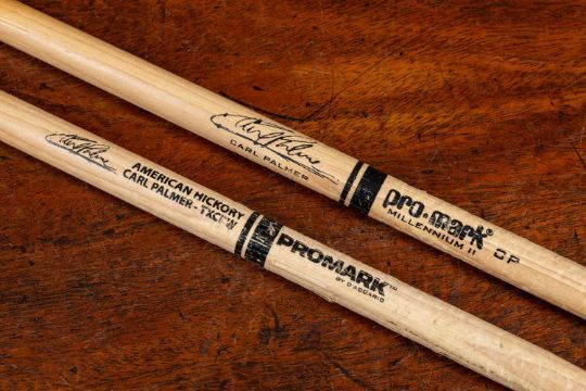 A signed Carl Palmer (of Emerson Lake & Palmer) drum head with a pair of used Carl Palmer drum sticks