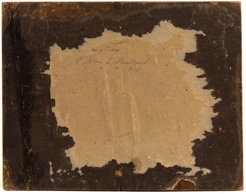 Re-stuck crack extending all the way vertically to extreme right of panel. Dirty. Another vertical small split to centre lower edge.