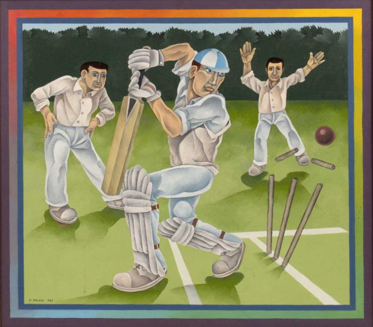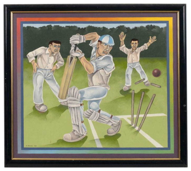 'Cleaned Bowled', signed and dated 1987, acrylic, 37 x 42cm