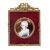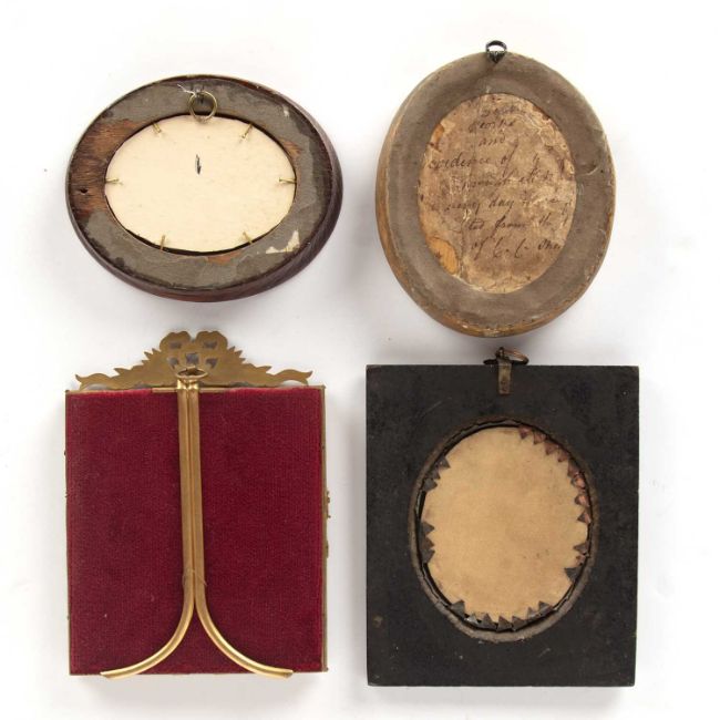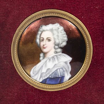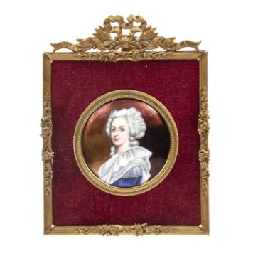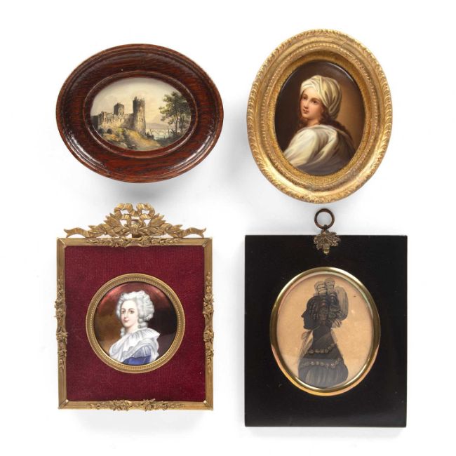 A Limoges style enamel circular miniature portrait of a lady, with coiffed grey wig, blue dress and lace shawl, signed 'Leroy', 6.2cm diameter, in gilt rectangular frame with ribbon tied cresting, together with an oval painted porcelain miniature portrait of Beatrice Cenci after Guido Reni, 8.5 x 6.5cm, a 19th century silhouette portrait of a lady, in ebonised frame and a small charcoal and wash sketch of a ruined castle, in oak oval frame. (4)