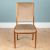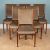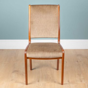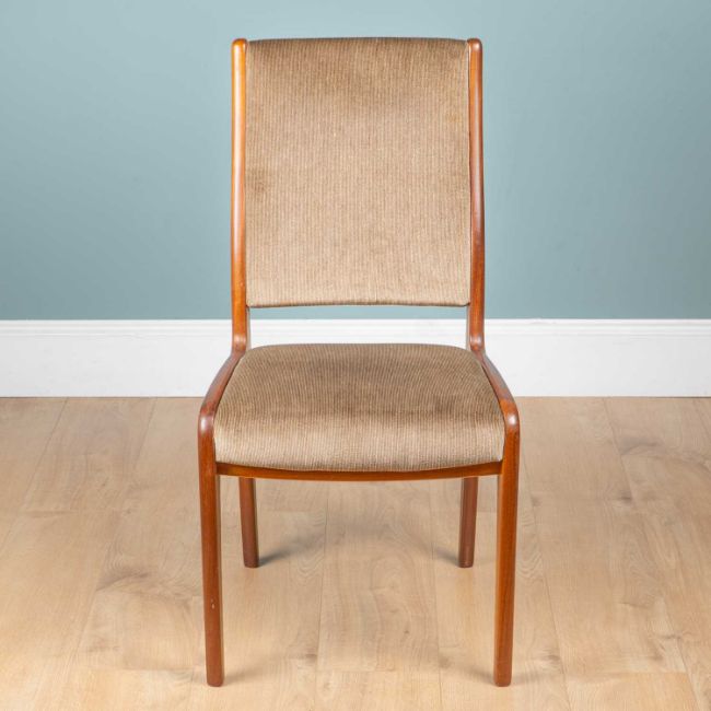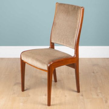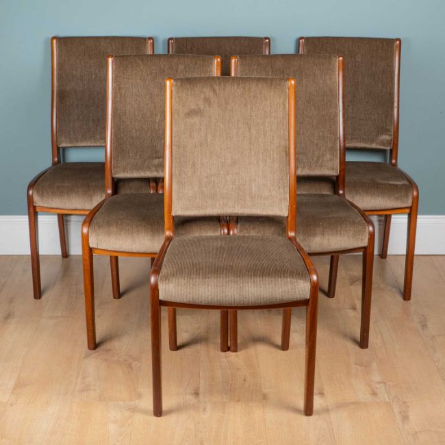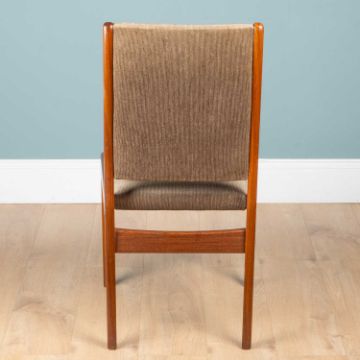 With teak frames and grey upholstered backs and seats.