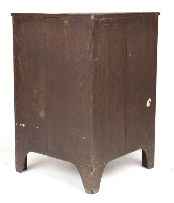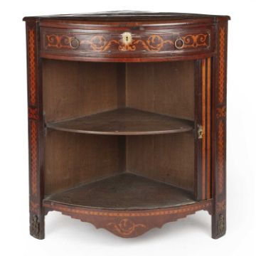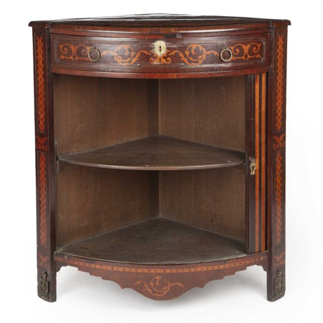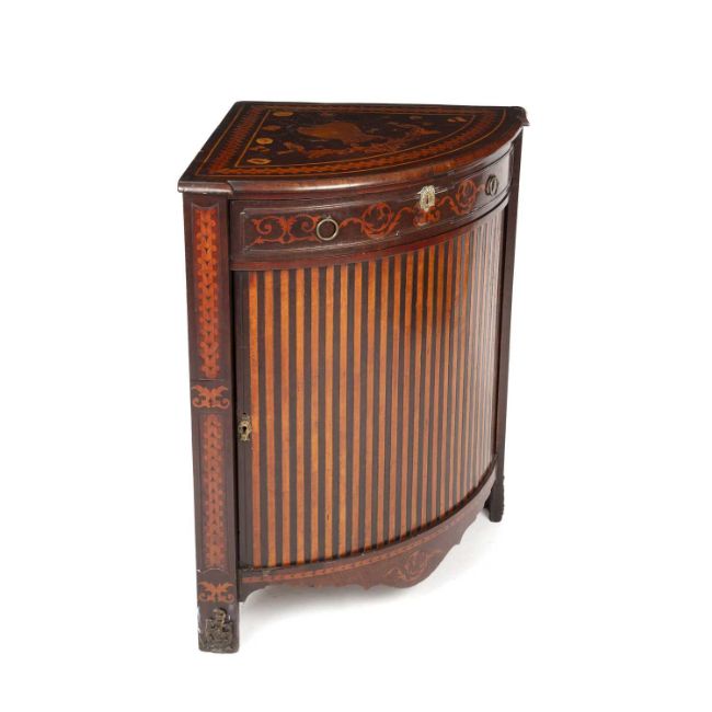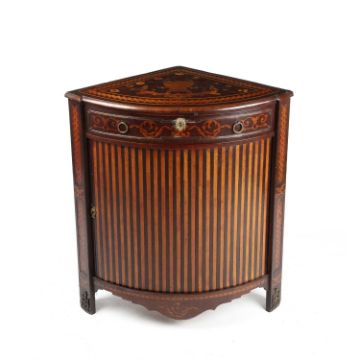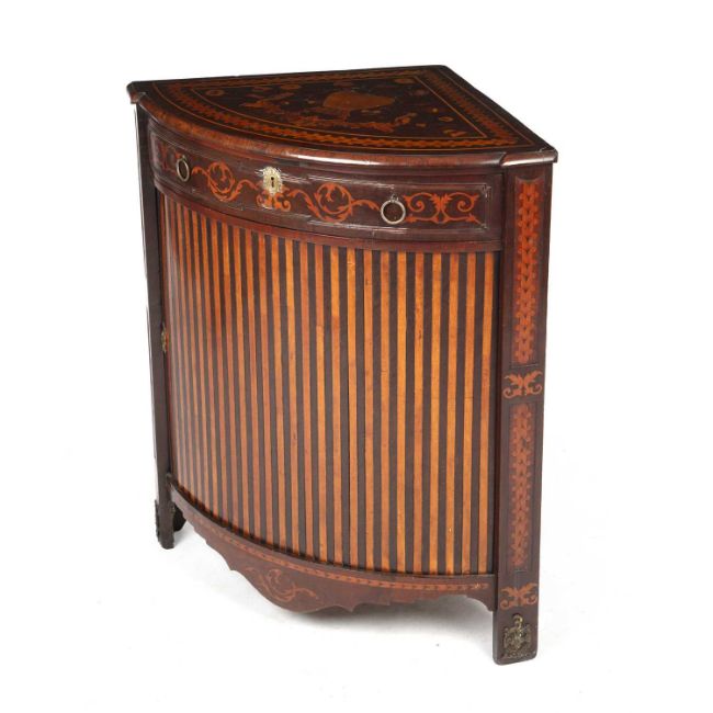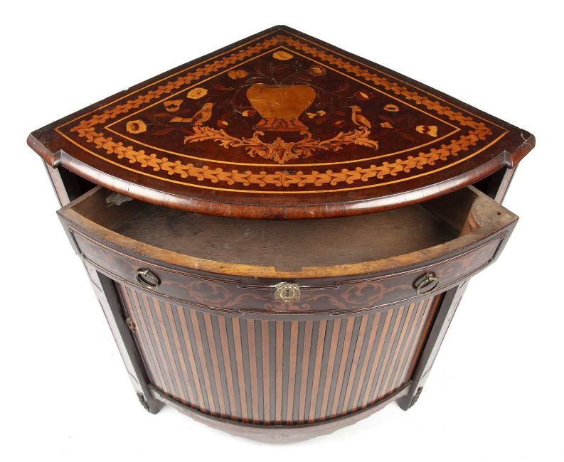 The early 19th century Dutch marquetry inlaid bow front floor standing corner cabinet with a single drawer and sliding door