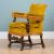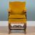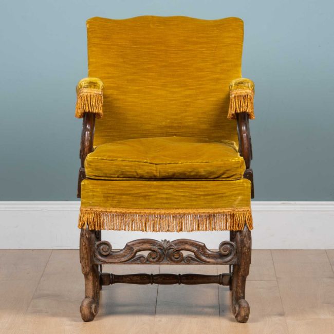The oak-framed open armchair with yellow draylon upholstery and fringed edging above carved legs and stretchers.