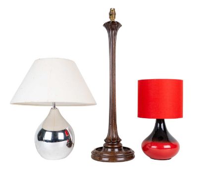 One glazed in red and black, another with a silvered finish, and the third of fluted carved wood with a circular base.
