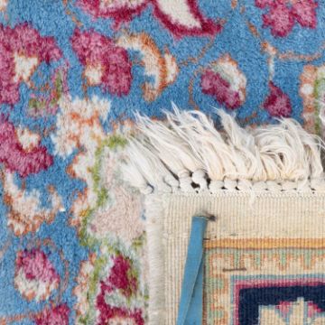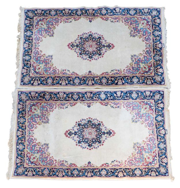 Each with a central medallion on a cream ground and scrolling off-cut corners, each signed to one end.
