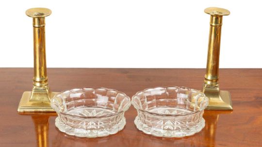 The bottle coasters with cut glass decoration, the pair of 19th century brass candlesticks modelled as Doric columns with square-section spreading bases.