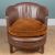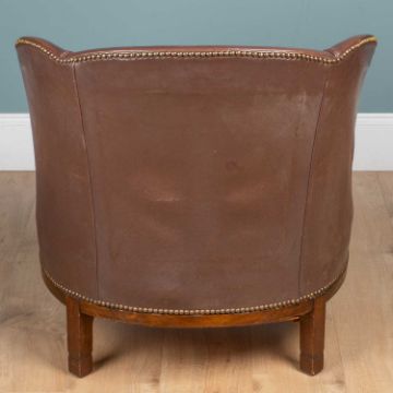 The oval chair upholstered in brown leatherette and standing on square legs.