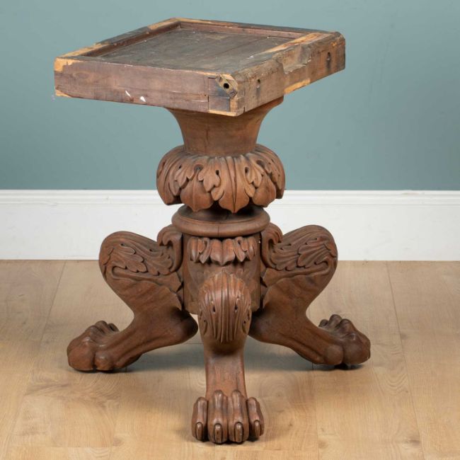 With a dramatically carved support and three lion legs.